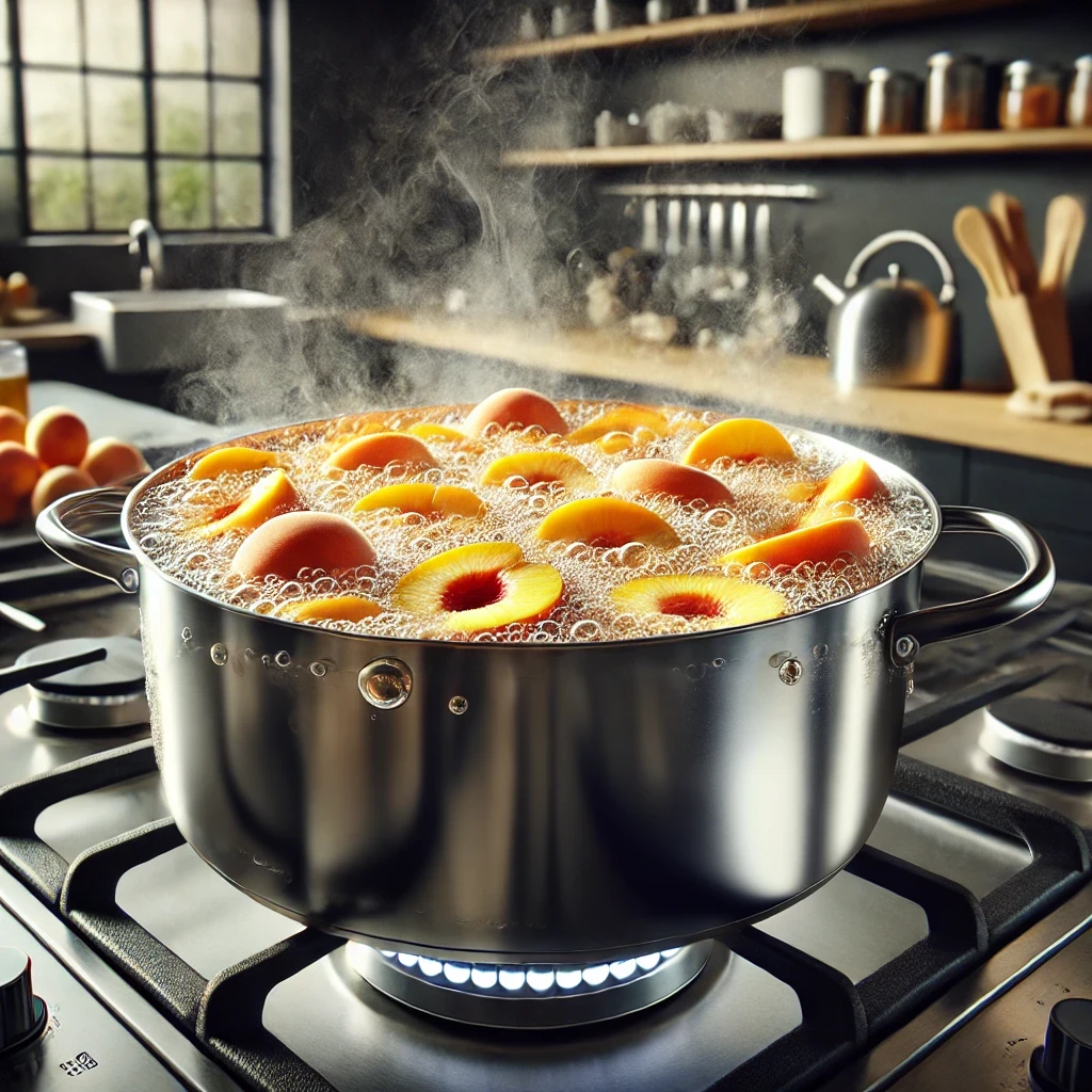 - 큰 냄비에 복숭아 조각과 물을 넣고 중간 불로 끓입니다.