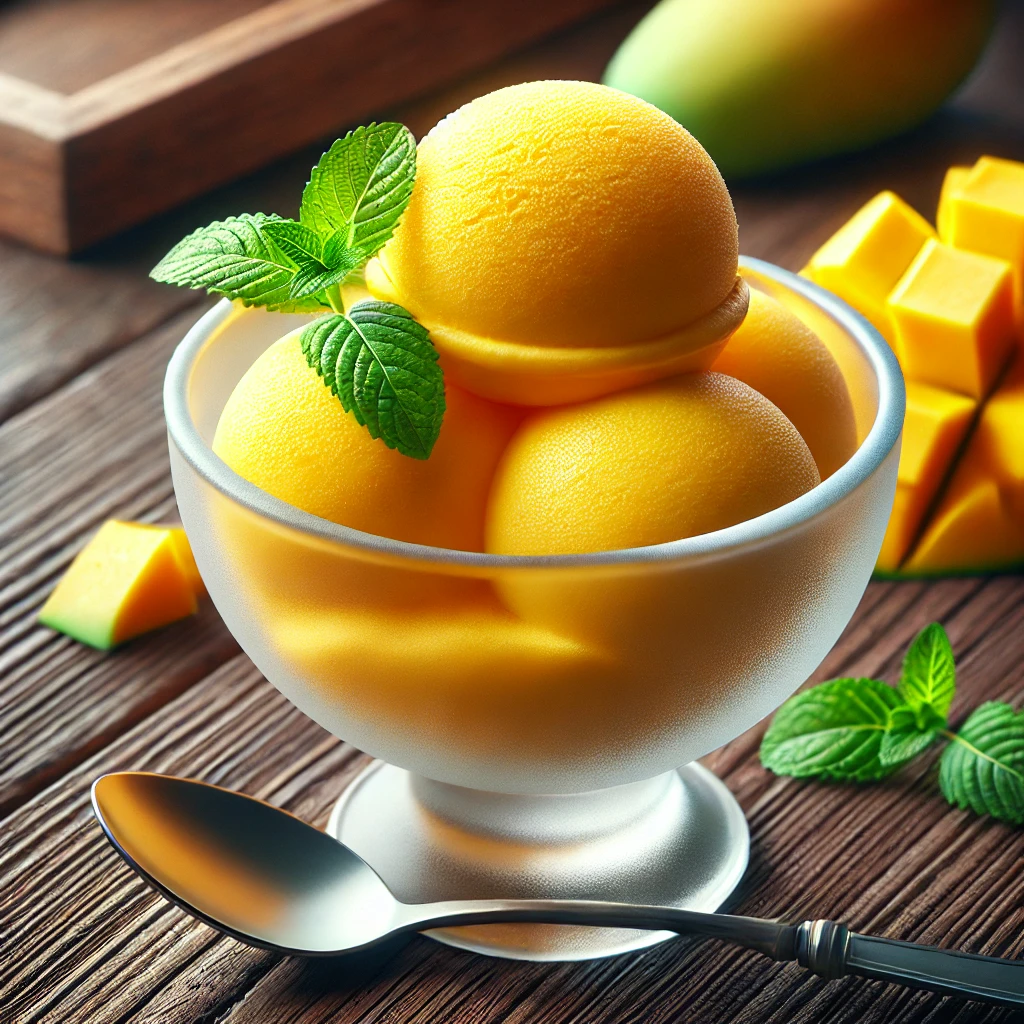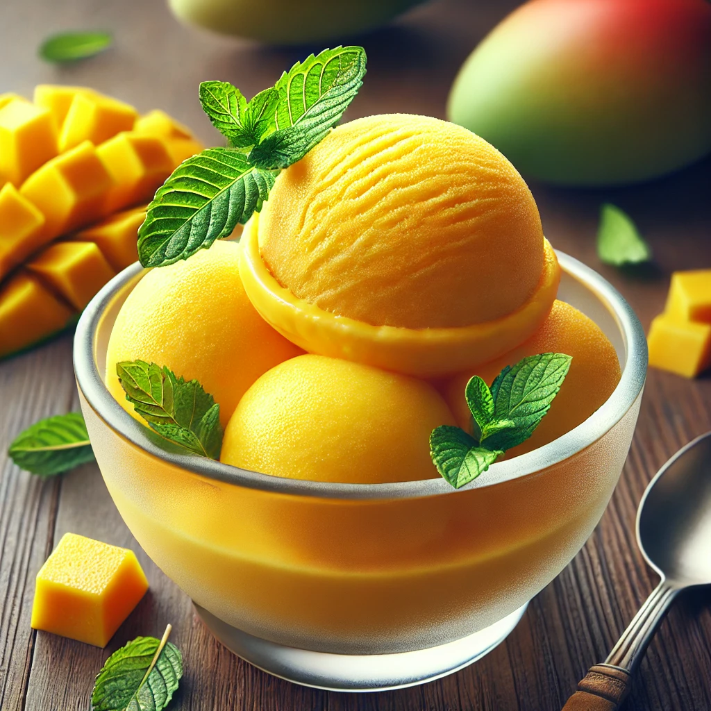 망고 소르베는 신선한 망고를 갈아 만든 시원한 디저트입니다. 망고 퓨레에 설탕물을 섞어 아이스크림 기계에 넣고 돌리기만 하면 완성됩니다. 소르베는 아이스크림보다 가벼워 여름철에 즐기기 좋습니다.