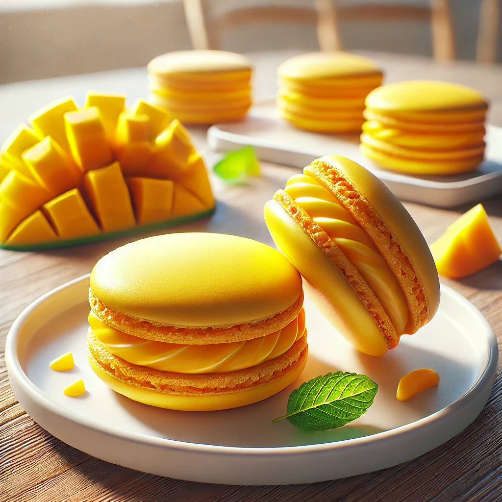 망고 마카롱은 바삭한 마카롱 속에 망고 크림이 들어간 디저트입니다. 마카롱 반죽을 구워 망고 크림을 채워 넣으면 완성됩니다. 마카롱은 만들기 까다롭지만, 그만큼 특별한 맛을 선사합니다.