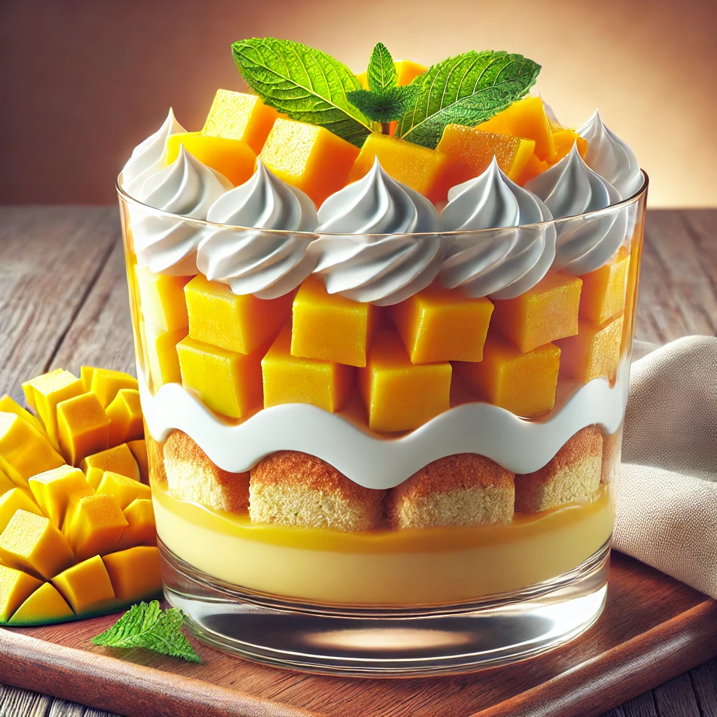 망고 트라이플은 여러 층으로 쌓아 만든 디저트입니다. 케이크 조각, 망고 퓨레, 생크림 등을 층층이 쌓아 유리잔에 담아 만듭니다. 트라이플은 맛도 좋고 보기도 아름다워 특별한 날에 잘 어울리는 디저트입니다.