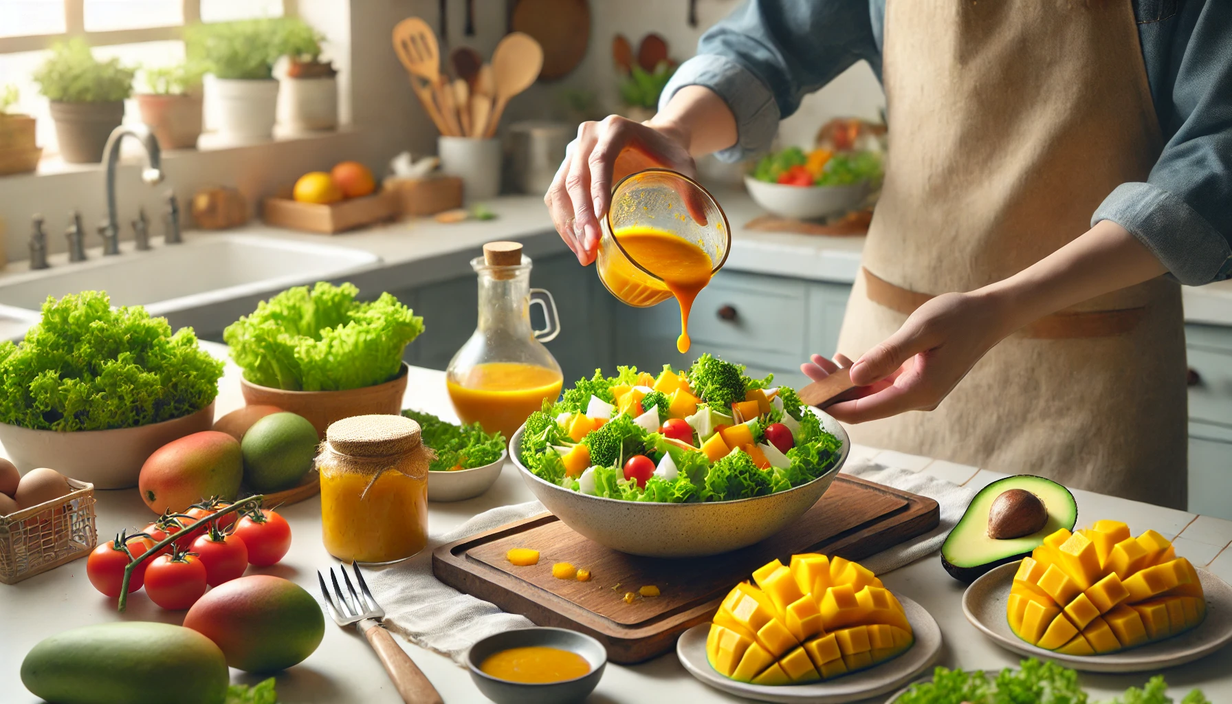 - 망고 샐러드 드레싱: 신선한 야채 샐러드에 망고 소스를 드레싱으로 사용하면 상큼하고 달콤한 맛이 샐러드에 생기를 더해줍니다. 망고 소스는 특히 그린 샐러드나 치킨 샐러드와 잘 어울립니다.