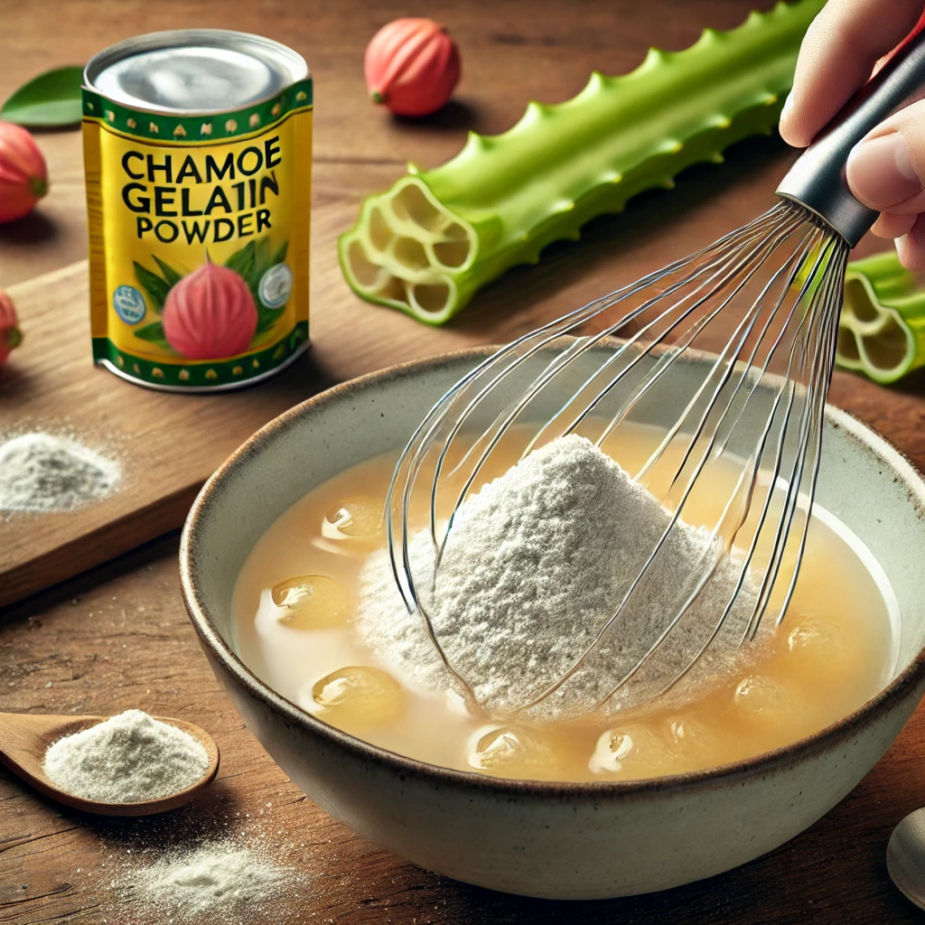 참외 젤리의 중요한 재료인 젤라틴을 준비하는 과정입니다. 젤라틴은 찬물에 불려 사용하면 더욱 부드럽고 매끈한 젤리를 만들 수 있습니다. 젤라틴 가루를 물에 골고루 섞어 불려줍니다.